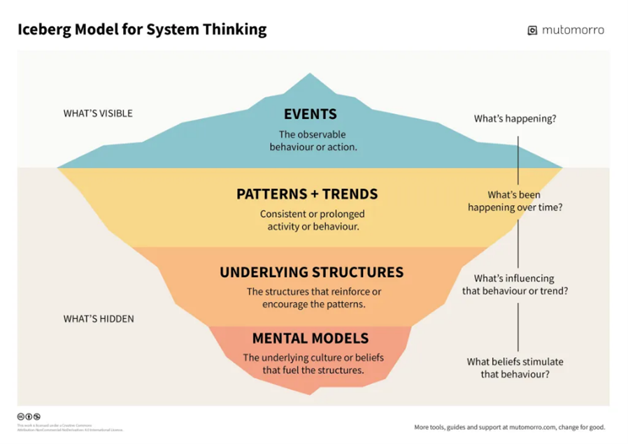 Bagi kami, fenomena ini dapat dianalisa lebih mendalam menggunakan kerangka iceberg of systems thinking atau gunung es pemikiran sistem (lihat gambar dari https://mutomorro.com/tools/iceberg-model/), sebuah pendekatan yang membantu melihat masalah bukan hanya dari gejala permukaan, tetapi hingga menelusuri penyebab-penyebab yang tersembunyi jauh di bawahnya. Model Gunung Es membagi pemahaman menjadi empat lapisan: peristiwa atau gejala yang terlihat, pola yang berulang, struktur sistemik yang mendasari, dan paradigma atau model mental yang menggerakkan seluruh sistem. Dengan memahami keempat lapisan ini, kita dapat menjelaskan mengapa ESG belum memberikan hasil optimal dan mengapa ESG-washing menjadi begitu marak.