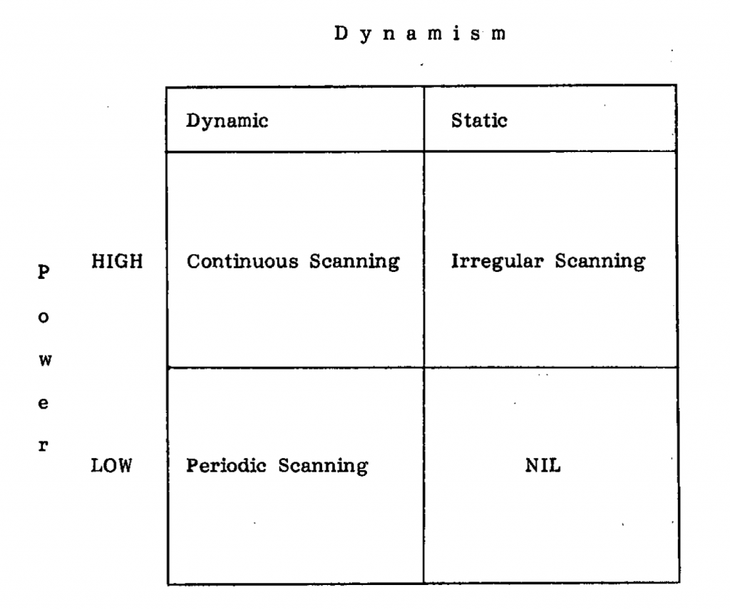 Saya menemukan makalah itu dan bisa mengaksesnya. Lalu, adakah grid legendaris itu? Tidak juga. “Lah? Koq nggak ada juga?” Begitu pikir saya lagi. Tetapi di makalah itu ada 1 bagan dan 2 matriks—kemajuan dibandingkan makalah tahun 1983 itu. Matriks yang dia bikin di situ namanya Power Dynamism Matrix. Power-nya dibagi menjadi lemah dan kuat, dan Dynamism-nya jadi statis dan dinamis (lihat Gambar 1).