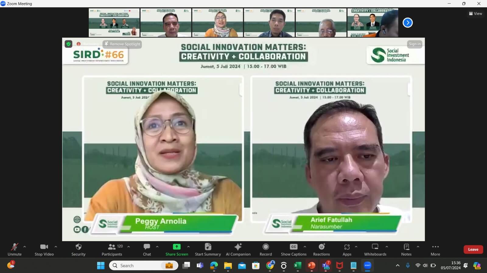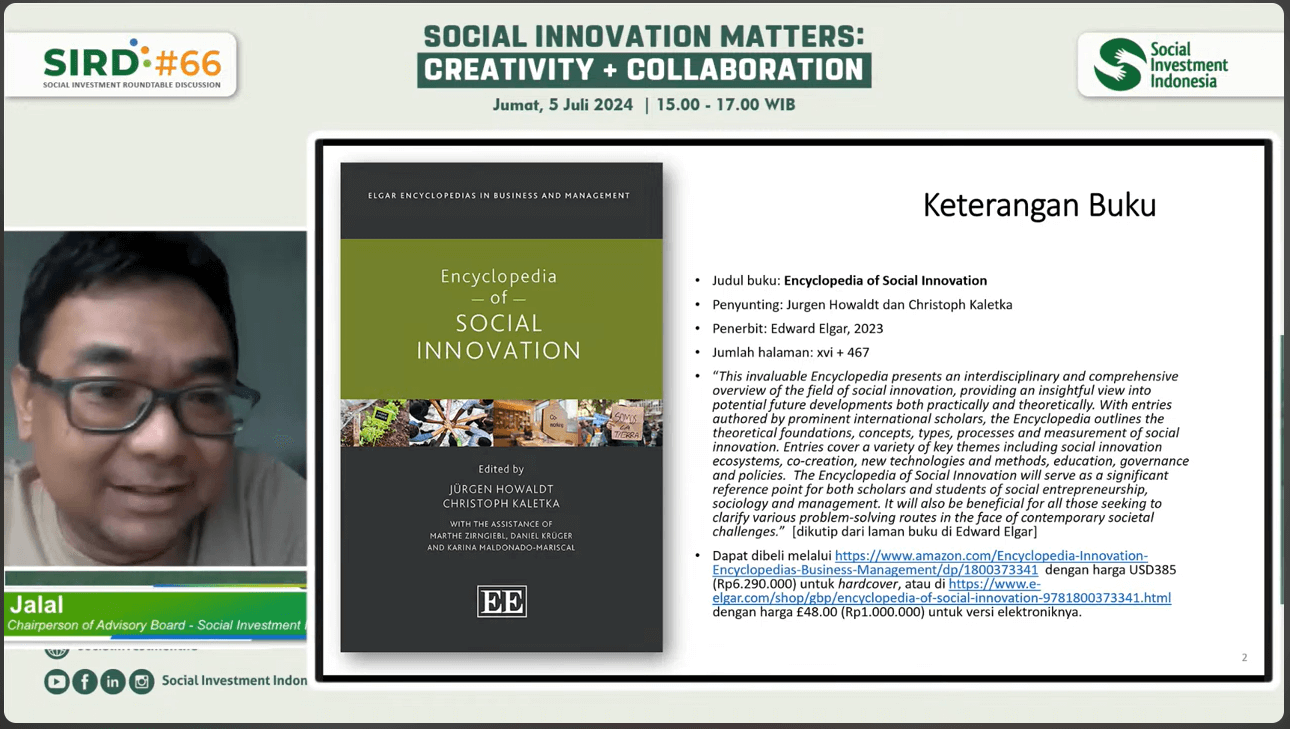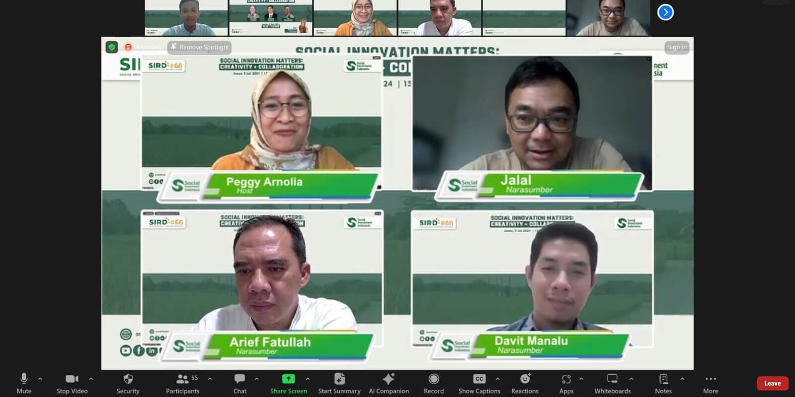 Social Investment Roundtable Discussion (SIRD) seri ke-66 yang dilaksanakan pada tanggal 5 Juli 2024 lalu, mengambil tema “Social Innovation Matters: Creativity + Collaboration”. Acara tersebut dihadiri tiga narasumber yaitu Arief Fatullah (Head of Sustainability di Great Giant Foods), Davit Manalu (Project Manager di Krealogi oleh Du Anyam) dan Jalal (Chairperson Advisory di Social Investment Indonesia).