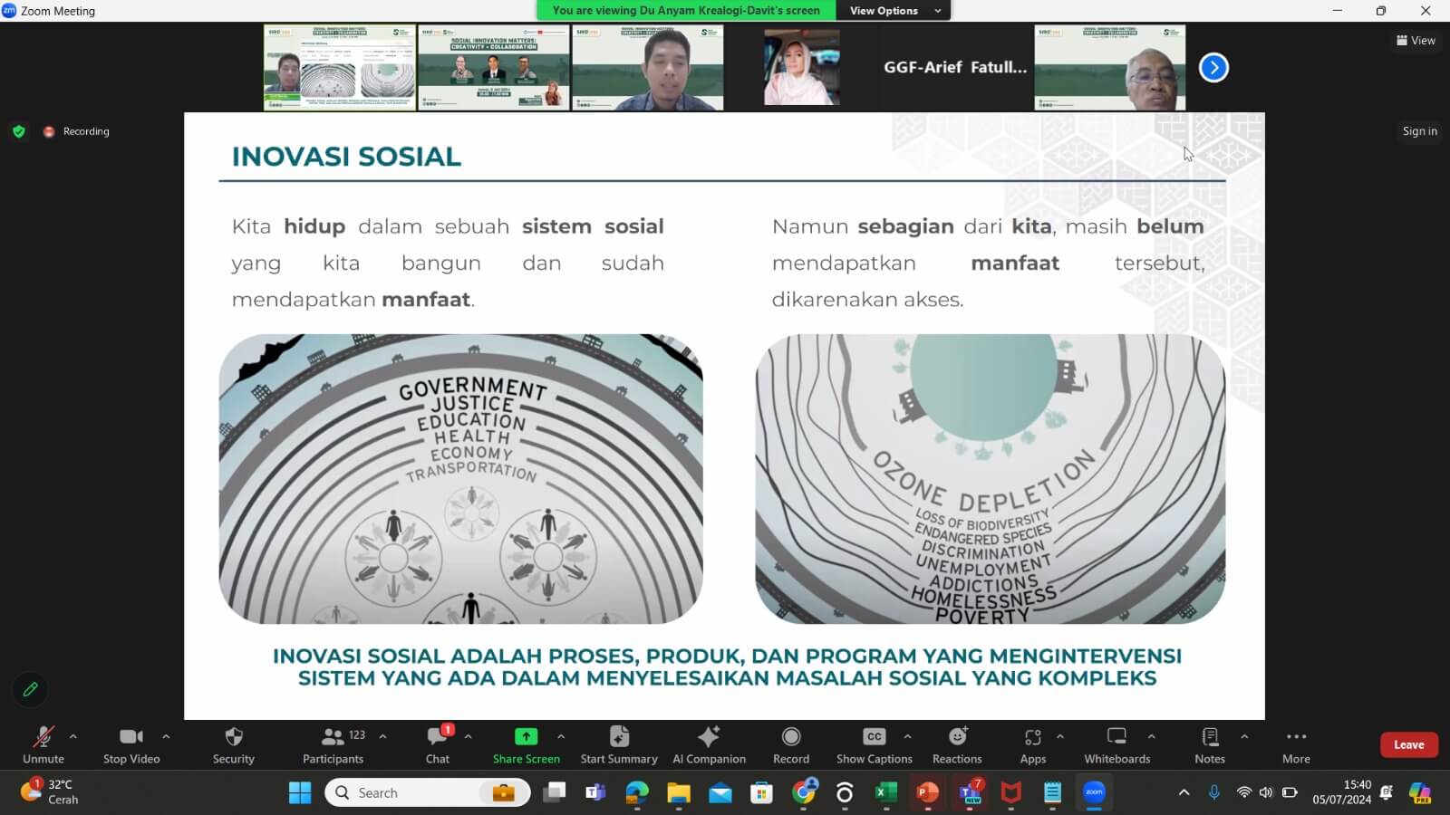 Sesi selanjutnya pemaparan materi oleh Davit Manalu dari Krealogi. Davit menerangkan mengenai sistem bisnis berbasis komunitas. Du Anyam memulai proses bisnis dari Indonesia Timur, dengan tujuan awal untuk meringankan isu yang dihadapi di sana, seperti stunting, minimnya lapangan kerja, kekurangan lahan pertanian.
