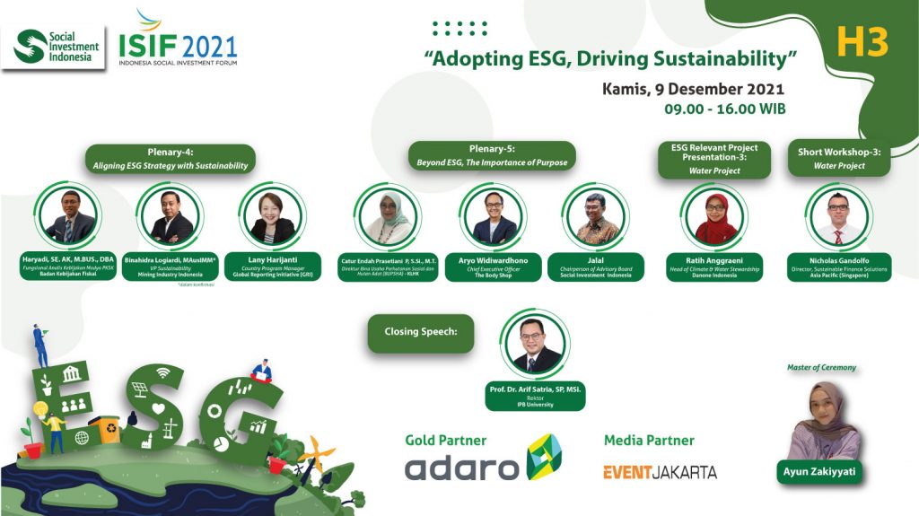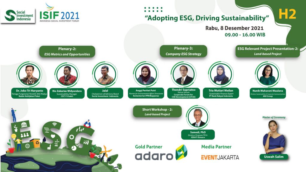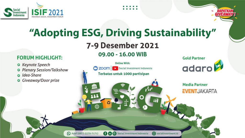 Indonesia Social Investment Forum (ISIF) 2021 yang telah diselenggarakan oleh Social Investment Indonesia (SII) dan pada tahun 2021 ini menjadi forum untuk keenam kalinya, dan untuk kedua kalinya dilakukan secara daring (full online), sebagai respon atas pandemi Covid-19. ISIF 2021 dengan tema “ADOPTING ESG, DRIVING SUSTAINABILITY”, telah menghadirkan lebih dari dua puluh (20) pembicara tingkat nasional, baik dari pengambil kebijakan, pelaku bisnis, akademisi, aktivis dan pelaku di lapangan, dan lebih dari 900 responden yang mendaftarkan diri untuk berpartisipasi dalam agenda tersebut.