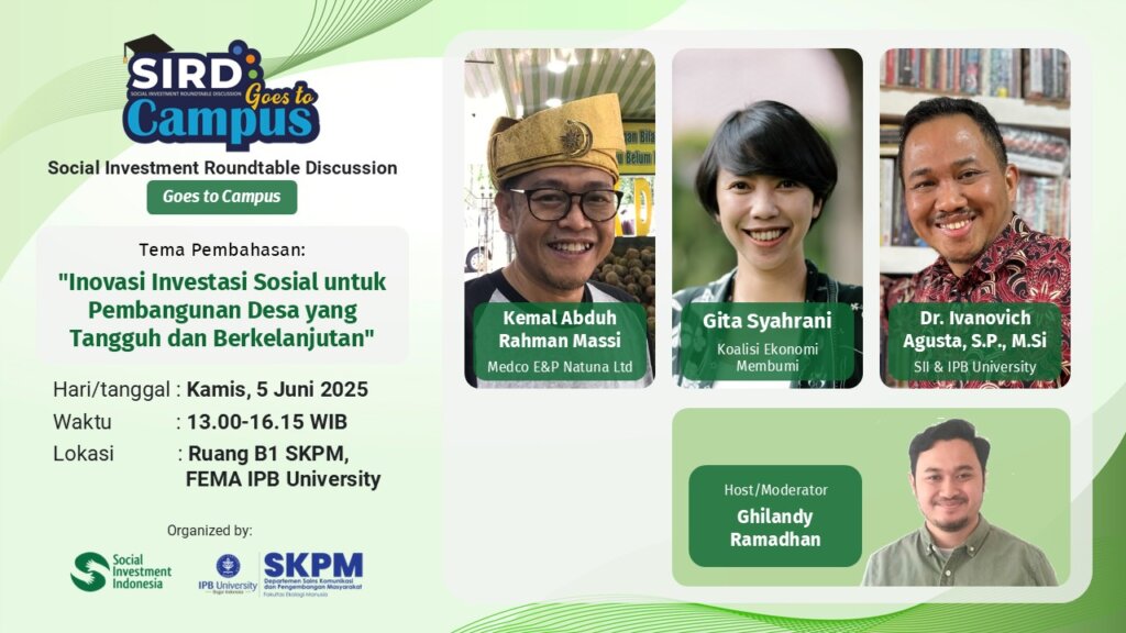 Presentasi ini disampaikan dalam SIRD Goes to Campus #3 di IPB University ini tentang “Inovasi Investasi Sosial untuk Pembangunan Desa yang Tangguh dan Berkelanjutan”. Acara ini dilaksanakan pada tanggal 5 Juni 2025, di IPB University dan hybrid melalui media Zoom Meeting Room.