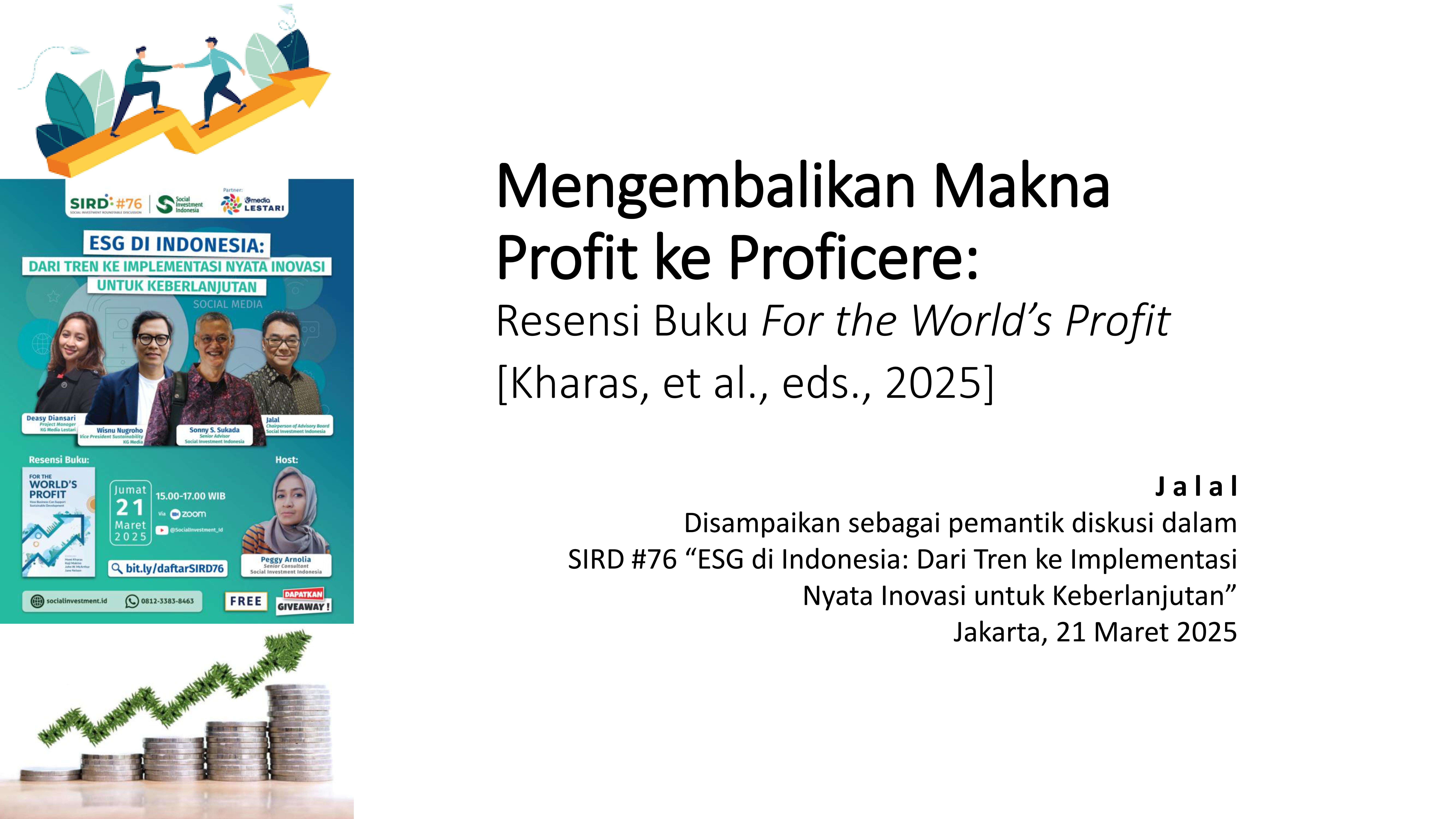 Presentasi ini disampaikan dalam SIRD seri-76 ini tentang “ESG di Indonesia: Dari Tren ke Implementasi Nyata Inovasi untuk Keberlanjutan”. Acara ini dilaksanakan pada tanggal 21 Maret 2025, melalui media Zoom Meeting Room
